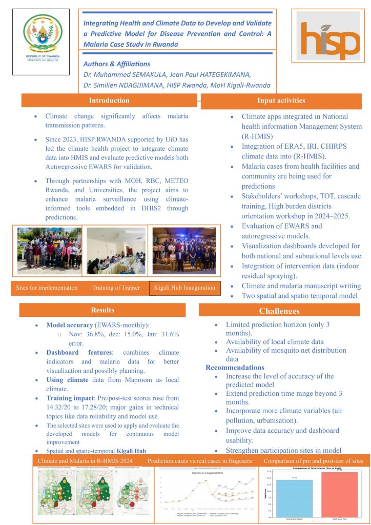 At the heart of the initiative, HISP Rwanda spearheaded the integration of climate data (such as ERA5, IRI, and CHIRPS) into Rwanda’s National Health Information Management System (R-HMIS). This integration allows for climate-sensitive predictive analytics using EWARS (Early Warning, Alert and Response System) and autoregressive models.