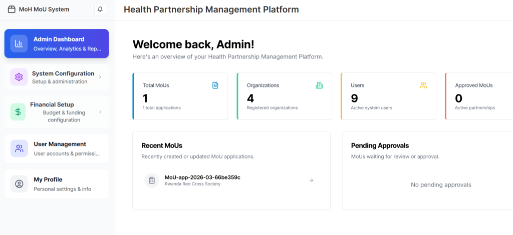 The Health Partnerships Management Platform (HPMP) is a digital solution developed by HISP Rwanda in collaboration with the Ministry of Health Rwanda to streamline the management of health partnerships. The platform digitizes the Memorandum of Understanding (MOU) application and approval process while supporting project implementation monitoring and reporting.